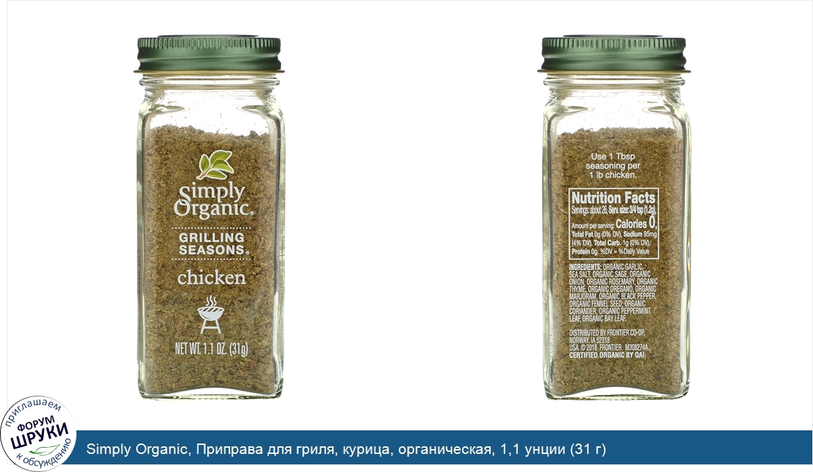 Simply Organic, Приправа для гриля, курица, органическая, 1,1 унции (31 г)