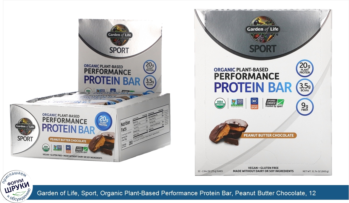 ru Garden of Life, Sport, Organic Plant-Based Performance Protein Bar, Peanut Butter Chocolate, 12 Bars, 2.64 oz (75 g) Each