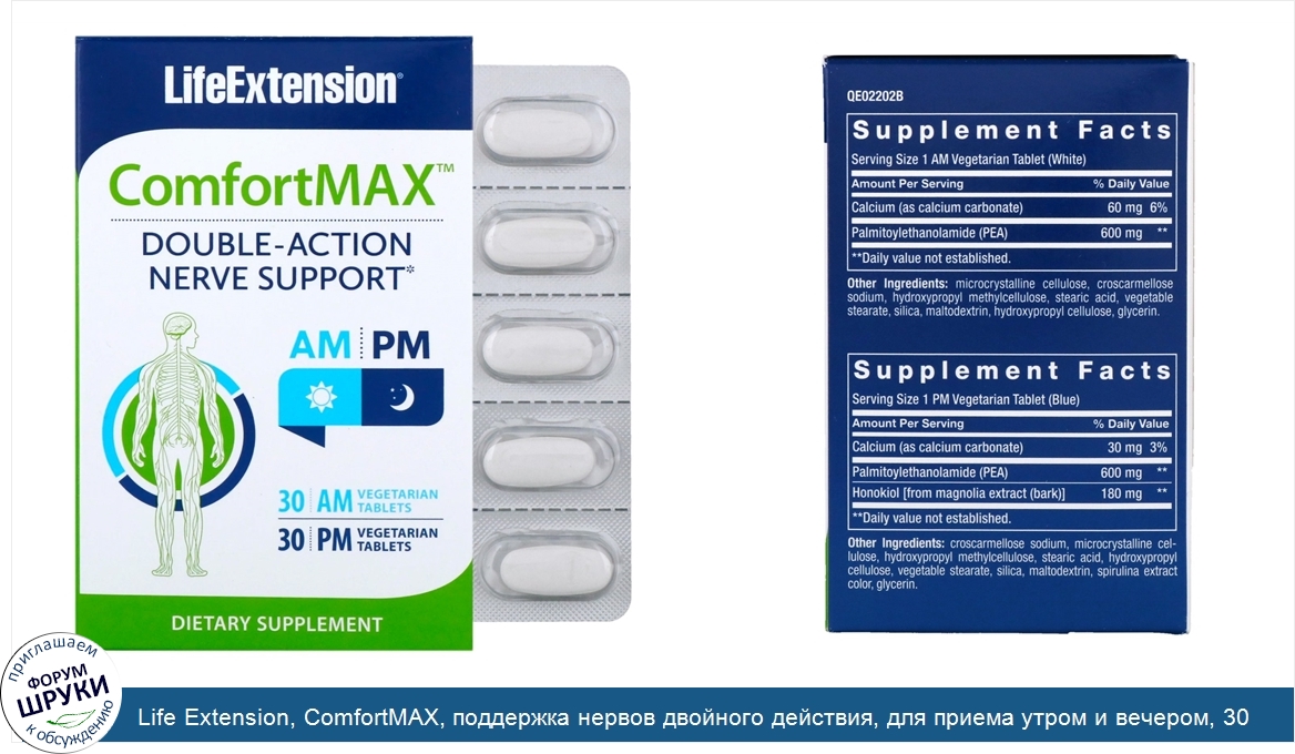 Друзья, если у вас есть отзыв/дополнение/комментарий/вопрос относительно Life Extension, ComfortMAX, поддержка нервов двойного действия, для приема утром и вечером, 30 вегетарианских таблеток каждая - напишите его ответом в эту тему (это будет полезно всему сообществу в целом и вам в отдельности).