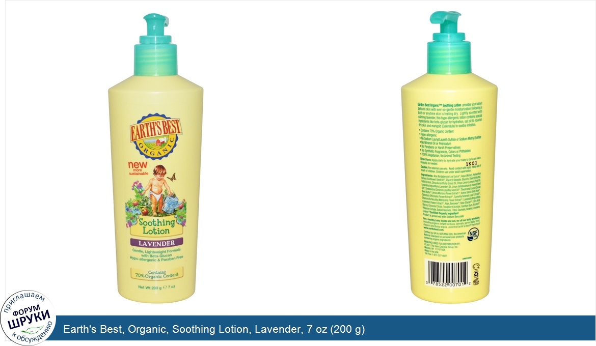 Друзья, если у вас есть отзыв/дополнение/комментарий/вопрос относительно Earth's Best, Organic, Soothing Lotion, Lavender, 7 oz (200 g) - напишите его ответом в эту тему (это будет полезно всему сообществу в целом и вам в отдельности).