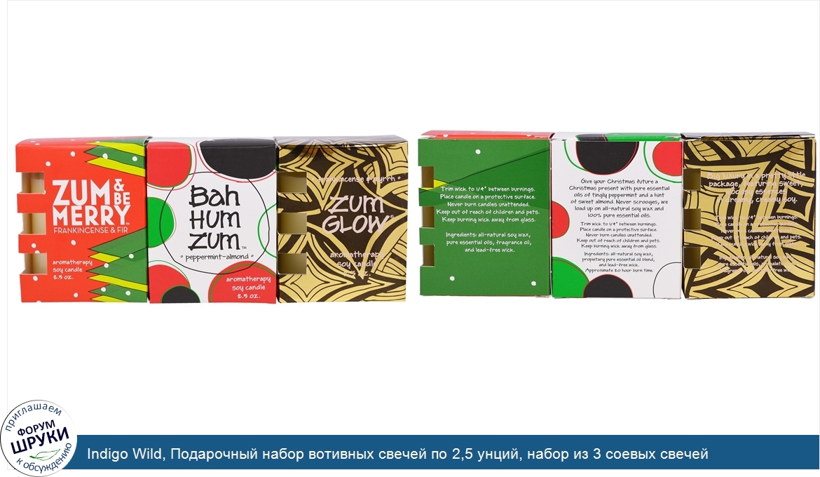 [DESCRIPT]All-Natural Products for the Body and Home. Give gifts in 3-D. The triple depth of Frankincense Myrrh, Zum Be Merry, and Bah Hum Zum votive glass candles knows how to handle the holidays. Burn baby, burn. Soy wax and lead-free wick. 20 hour burn time each. Contains:. 1. Zum Be Merry - Frankincense Fir - Aromatherapy Soy Candle. Happy Whiffs of Sweet N' Sappy . 2. Zum Glow - Frankincense Myrrh - Aromatherapy Soy Candle. Wise up to whiffs of rich, deep, and woodsy. Big luxury in a pretty little package, featuring sweet, woodsy essences in dreamy, creamy soy. 3. Bah Hum Zum - Peppermint - Almond - Aromatherapy Soy Candle. Give your Christmas future a Christmas present with pure essential oils of tingly peppermint and a hint of sweet almond. Never-scrooges, we load up on all-natural soy wax and 100% pure essential oils.[/DESCRIPT]... (описание дополняется)