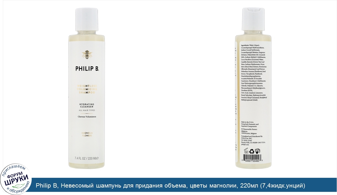 Друзья, если у вас есть отзыв/дополнение/комментарий/вопрос относительно Philip B, Невесомый шампунь для придания объема, цветы магнолии, 220мл (7,4жидк.унций) - напишите его ответом в эту тему (это будет полезно всему сообществу в целом и вам в отдельности).