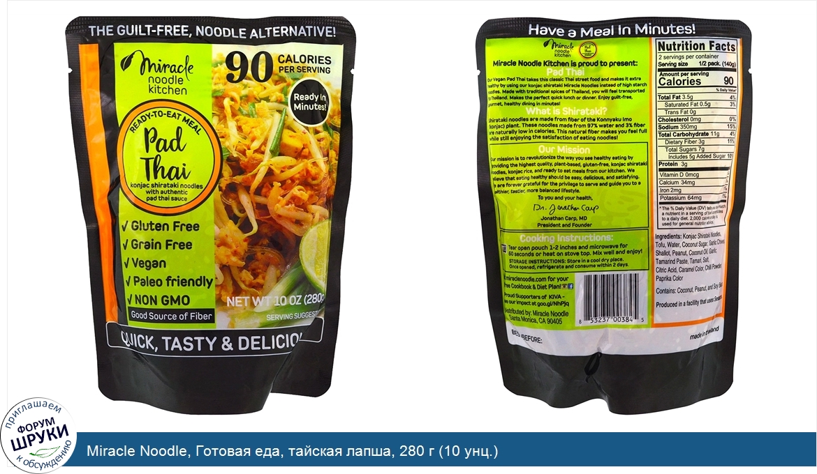 [DESCRIPT]Konjac Shirataki Noodles with Authentic Pad Thai Sauce. The Guilt-Free Noodle Alternative! 80 Calories per Serving. Ready in Minutes! Ready-to-Eat Meal. Gluten-Free. Grain Free. Vegan. Paleo Friendly. Non GMO. Good Source of Fiber. Quick, Tasty Delicious! Have a Meal in Minutes! Miracle Noodle Kitchen is proud to present:. Pad Thai. Our Vegan Pad Thai takes this classic Thai street food and makes it extra healthy by using our konjac shirataki Miracle Noodles instead of high starch noodles. Made the perfect quick lunch or dinner. Enjoy guilt-free, gourmet, healthy dining in minutes! What is Shirataki? Shirataki noodles are made from fiber of the Konnyaku Imo (konjac) plant. These noodles made from 97% water and 3% fiber are naturally low in calories. This natural fiber makes you feel full while still enjoying the satisfaction of eating noodles! Our Mission. Our mission is to revolutionize the way you see healthy eating by providing the highest quality, plant-based, gluten-free, konjac shirataki noodles, konjac rice, and ready to eat meals from our kitchen. We believe that eating healthy should be easy, delicious, and satisfying. We are forever grateful for the privilege to serve and guide you to a healthier tastier, more balanced lifestyle. To you and your health,. Jonathan Carp, MD. President and Founder.[/DESCRIPT]... (описание дополняется)