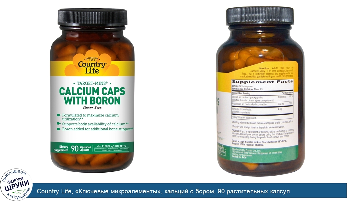 ru Country Life, «Ключевые микроэлементы», кальций с бором, 90 растительных капсул