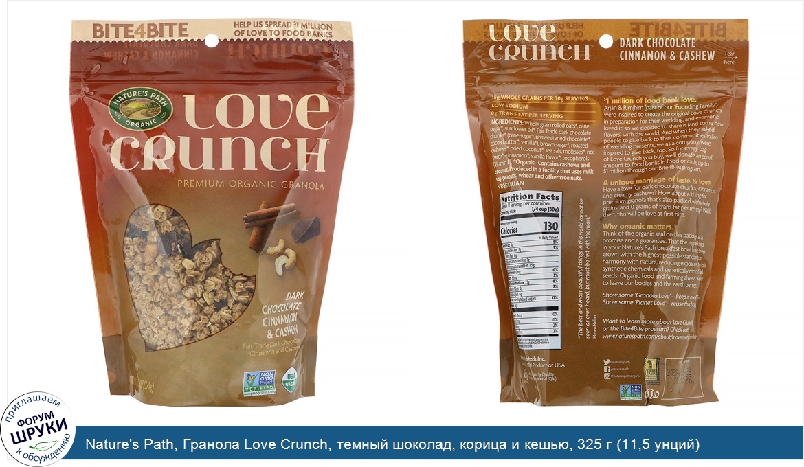 Nature's Path, Гранола Love Crunch, темный шоколад, корица и кешью, 325 г (11,5 унций)