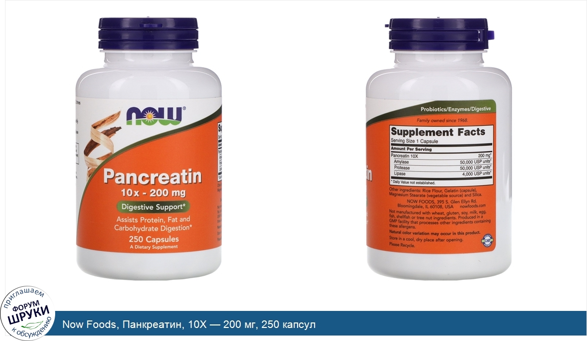 ru Now Foods, Панкреатин, 10X — 200 мг, 250 капсул