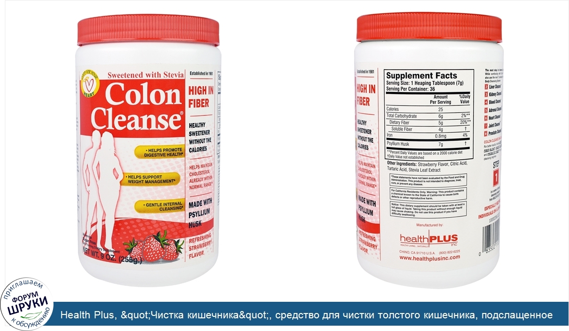 Друзья, если у вас есть отзыв/дополнение/комментарий/вопрос относительно Health Plus, "Чистка кишечника", средство для чистки толстого кишечника, подслащенное стевией, с освежающим клубничным вкусом, 9 унций (255 г) - напишите его ответом в эту тему (это будет полезно всему сообществу в целом и вам в отдельности).