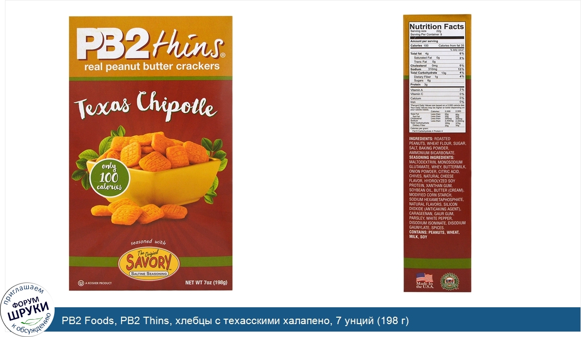 [DESCRIPT]Real Peanut butter Crackers. Only 100 Calories. Seasoned with The Original Savory Saltine Seasoning. A Kosher Product. Certified GMO Free. We've combined the bold Texas flavor of the Texas Chipotle Savory Saltine Seasoning with the rich peanutty goodness of our PB2thins to create this distinctive and delectable snack. Sweet, savory, delicious. PB2thins Texas Chipotle are a taste sensation unlike any other. One bite and you'll be hooked![/DESCRIPT]... (описание дополняется)