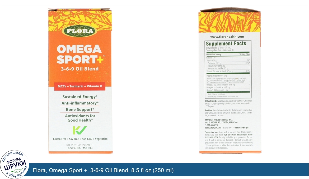 [DESCRIPT]MCTs + Turmeric + Vitamin D. Sustained Energy. Anti-Inflammatory. Bone Support. Antioxidants for Good Health. Kosher Check. Gluten-Free + Soy-Free- Non-GMO + Vegetarian. Dietary Supplement. Adventure Is Calling. At Flora, our Pacific Northwest roots call us to climb mountains, explore the ocean, and run new distances. The adventures are limitless. Rain or shine. From exploring new trails, to running longer distances, getting on a PR on your power clean, or just keeping up with your kids at the park - we know your body needs clean, wholesome fuel to runs its best. That's why we created Omega Sport+, an oil that pushes the boundaries, including omega-3, -6, and -9, plus MCTs, turmeric, and vitamin D. This is no ordinary oil blend, this is fuel for life, so you can push the boundaries on what is possible. Omega Sport+ provides the foundation for good health by providing your body with the essential fatty acids it requires. We're talking about omega-3-6, -9, which are the health fats your body needs. The addition of medium-chain triglycerides (MCTs) further supports energy production in the brain, heart, and muscles. Omega Sport+ includes turmeric, which in addition to being an anti-inflammatory, also aids in digestion. Vitamin D supports bone health. Omega Sport+ provides more energy, more strength, and more adventure. This is no ordinary oil, because you are no ordinary athlete.[/DESCRIPT]... (описание дополняется)