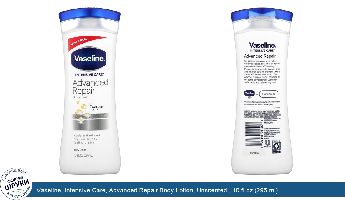 [DESCRIPT]Non-Greasy. +Vaseline® Jelly. Heals and Relieves Dry Skin, Without Feeling Greasy. Accepted National Eczema Association. Cosmetic Product for Moisturization. We believe everyone, everywhere deserves healed skin. That's why we created the Vaseline® Healing Project, to help people living in crisis and disaster care for their skin. Here, Vaseline® Jelly is a necessity. Our Advanced Repair lotion, powered by the same extraordinary Vaseline® Jelly, heals and relieves dry skin. Vaseline® Jelly + Unscented. Our unique formula includes unscented moisturizers and Vaseline® Jelly, Without feeling greasy.[/DESCRIPT]... (описание дополняется)