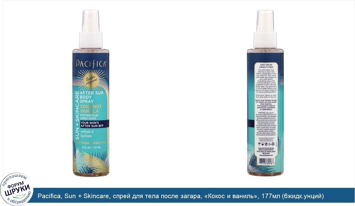 Друзья, если у вас есть отзыв/дополнение/комментарий/вопрос относительно Pacifica, Sun + Skincare, спрей для тела после загара, «Кокос и ваниль», 177мл (6жидк.унций) - напишите его ответом в эту тему (это будет полезно всему сообществу в целом и вам в отдельности).