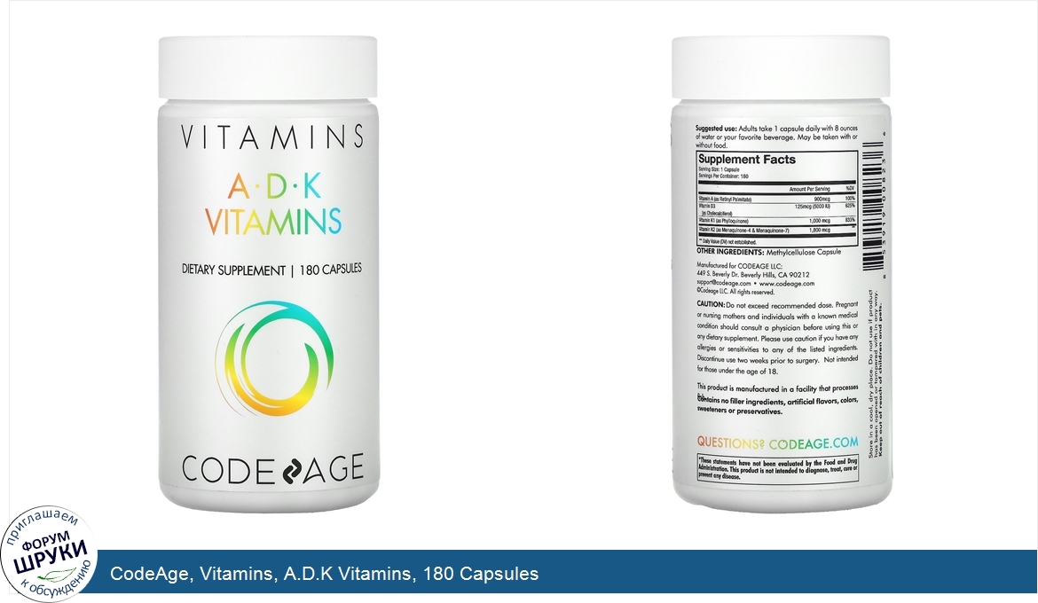 Друзья, если у вас есть отзыв/дополнение/комментарий/вопрос относительно CodeAge, Vitamins, A.D.K Vitamins, 180 Capsules - напишите его ответом в эту тему (это будет полезно всему сообществу в целом и вам в отдельности).