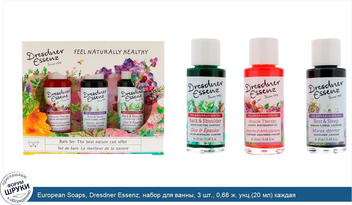 Друзья, если у вас есть отзыв/дополнение/комментарий/вопрос относительно European Soaps, Dresdner Essenz, набор для ванны, 3 шт., 0,68 ж. унц.(20 мл) каждая - напишите его ответом в эту тему (это будет полезно всему сообществу в целом и вам в отдельности).