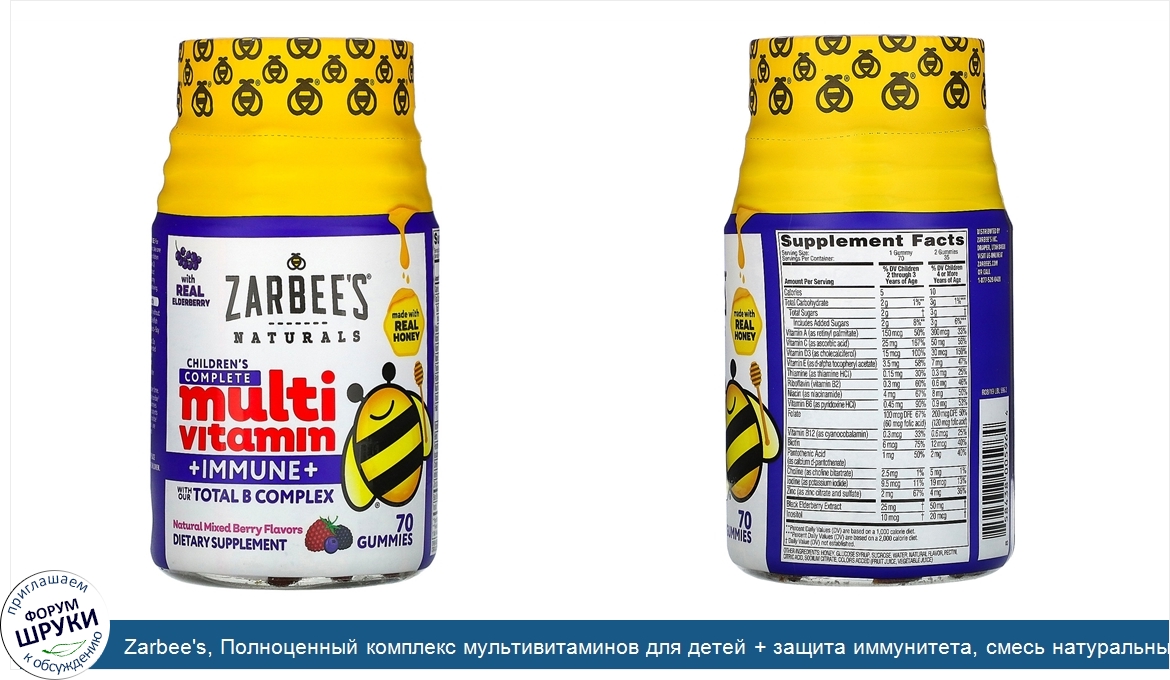[DESCRIPT]Made With Real Honey. With Our Total B Complex. Dietary Supplement. No High Fructose Corn Syrup. No Artificial Sweeteners. No Artificial Flavors. No Gelatin. Gluten-Free. Allergen Friendly. Wholesome Complete. Dr. Zak Zarbock, a pediatrician and father, couldn't find effective chemical-free products to keep the whole family healthy, so he created his own products, including handpicked natural ingredients, whenever possible. The result is Zarbee's Naturals. Excellent source of 13 essential vitamins minerals including A, C, D3, Zinc and our total B complex. Colors from natural sources. With real elderberry extract for immune support.[/DESCRIPT]... (описание дополняется)