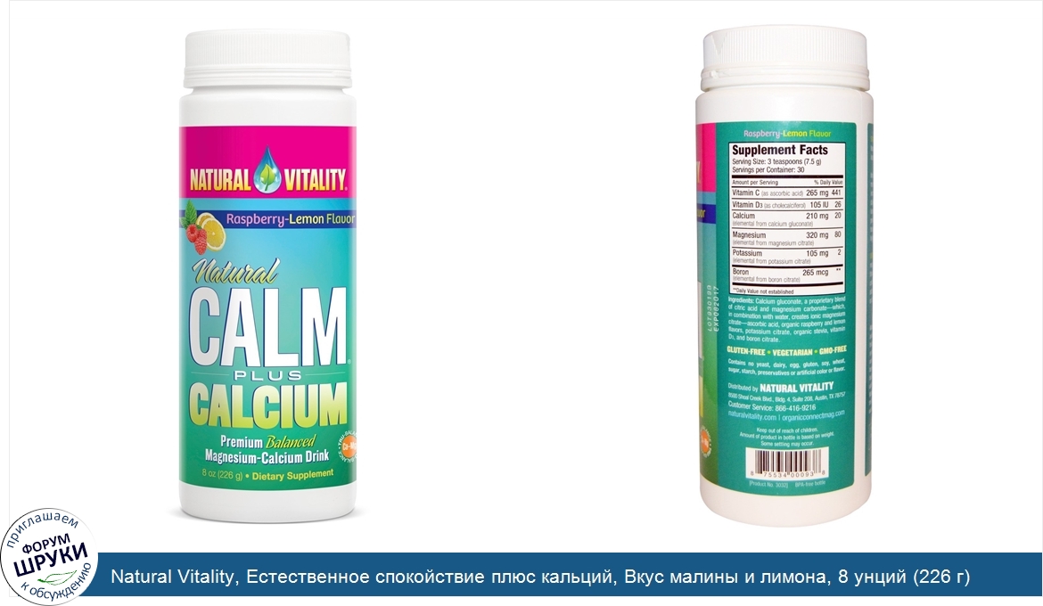 Друзья, если у вас есть отзыв/дополнение/комментарий/вопрос относительно Natural Vitality, Естественное спокойствие плюс кальций, Вкус малины и лимона, 8 унций (226 г) - напишите его ответом в эту тему (это будет полезно всему сообществу в целом и вам в отдельности).