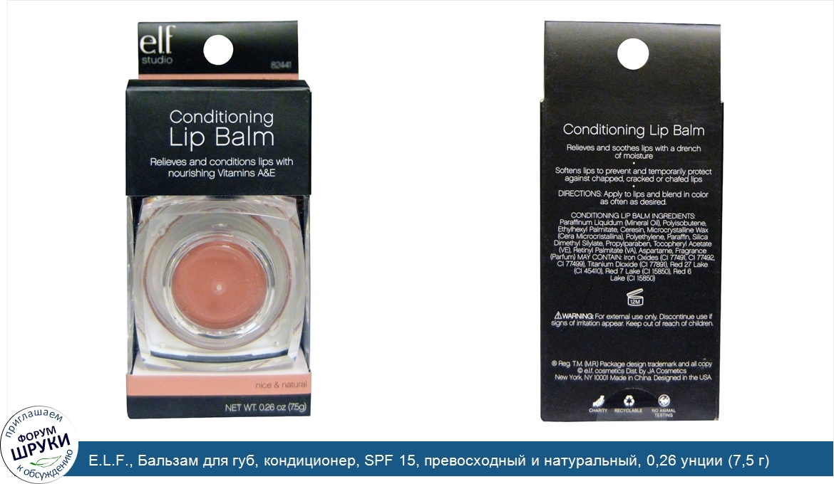 E.L.F., Бальзам для губ, кондиционер, SPF 15, превосходный и натуральный, 0,26 унции (7,5 г)