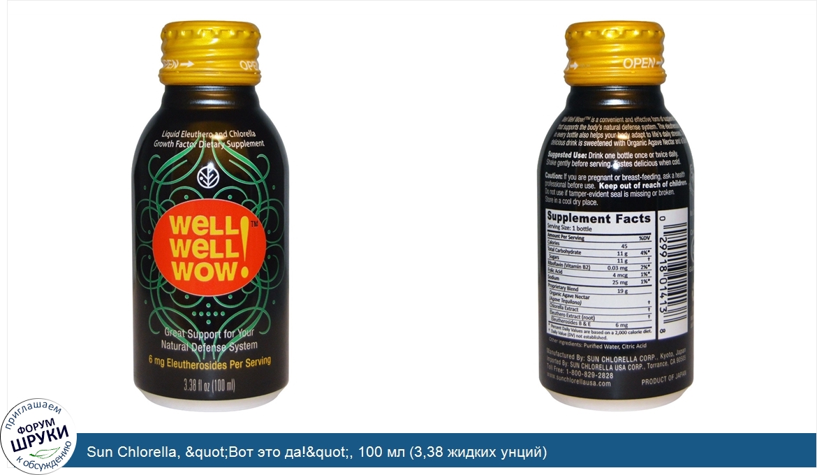[DESCRIPT]Liquid Eleuthero and Chlorella. Growth Factor. Dietary Supplement. Great Support for your Natural Defense System. 6 mg Eleutherosides Per Serving. GMP Certified. No Caffeine. Certified Gluten-Free. Well Well Wow! is a convenient and effective form of supplementation that supports the body's natural defense system. The eleutheroside activity in every bottle also helps your body adapt to life's daily stresses. This delicious drink is sweetened with Organic Agrave Nectar and is Gluten Free.[/DESCRIPT]... (описание дополняется)