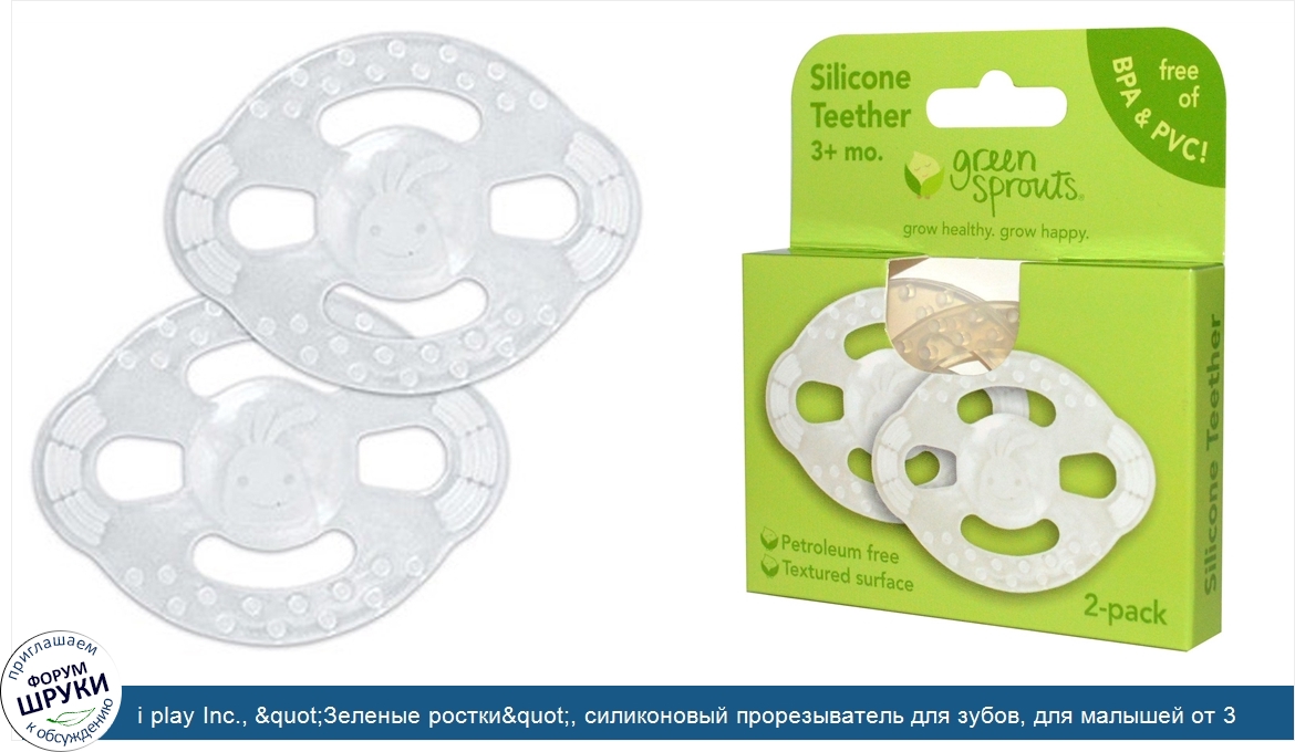 Друзья, если у вас есть отзыв/дополнение/комментарий/вопрос относительно i play Inc., "Зеленые ростки", силиконовый прорезыватель для зубов, для малышей от 3 месяцев, 2 упаковки - напишите его ответом в эту тему (это будет полезно всему сообществу в целом и вам в отдельности).
