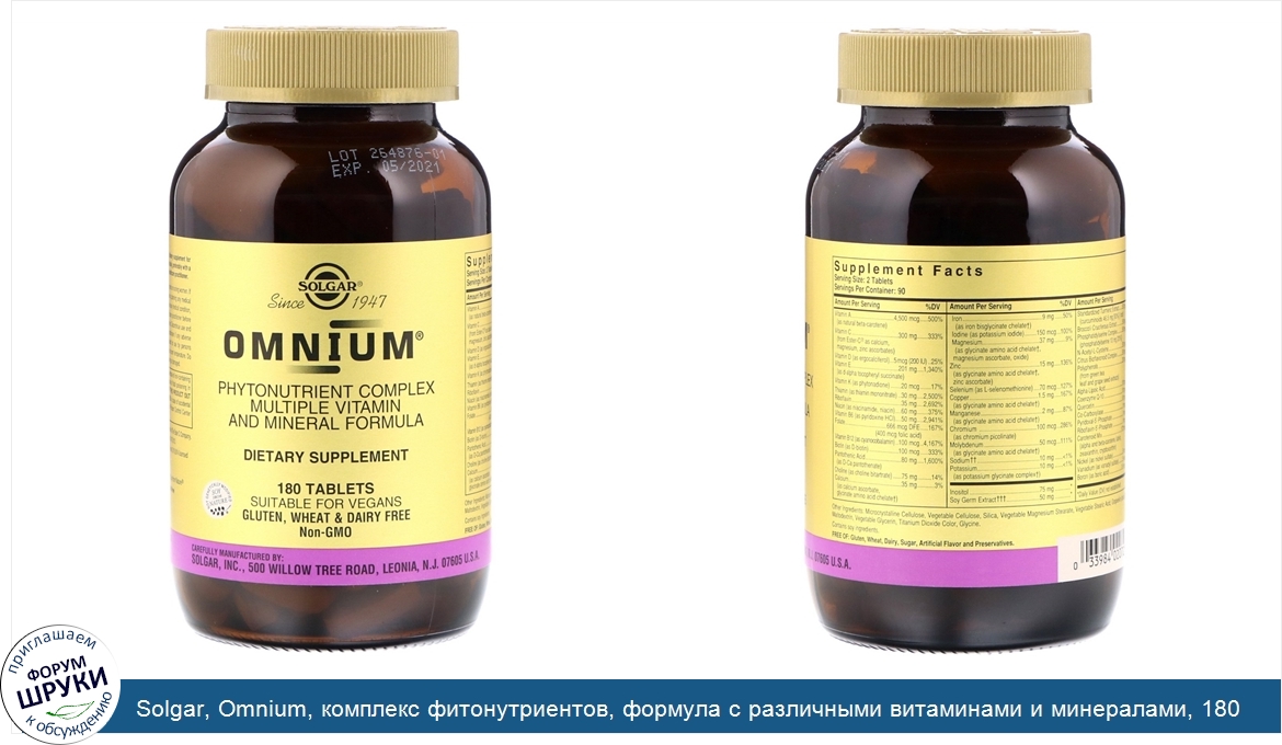 Solgar, Omnium, комплекс фитонутриентов, формула с различными витаминами и минералами, 180 таблеток