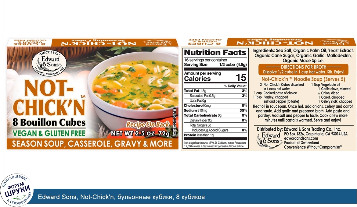 Друзья, если у вас есть отзыв/дополнение/комментарий/вопрос относительно Edward Sons, Not-Chick'n, бульонные кубики, 8 кубиков - напишите его ответом в эту тему (это будет полезно всему сообществу в целом и вам в отдельности).