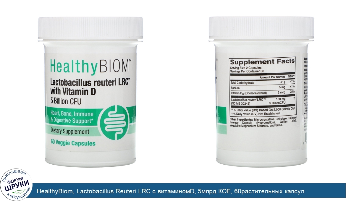 . HealthyBIOM™. Lactobacillus Reuteri LRC. ™. с витамином D. 5 млрд КОЕ и капсула отсроченного высвобождения. Lactobacillus Reuteri LRC. ™. и. веганский витамин D. Поддержка сердца, костей, иммунитета и пищеварен...
