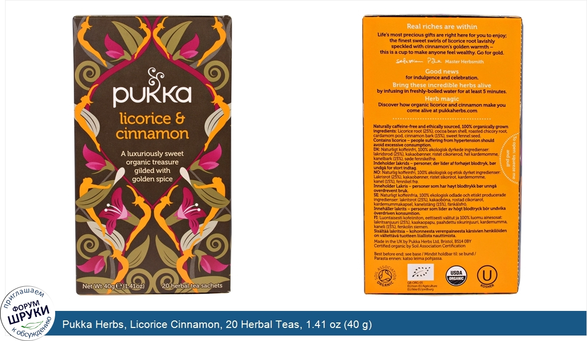 Друзья, если у вас есть отзыв/дополнение/комментарий/вопрос относительно Pukka Herbs, Licorice Cinnamon, 20 Herbal Teas, 1.41 oz (40 g) - напишите его ответом в эту тему (это будет полезно всему сообществу в целом и вам в отдельности).