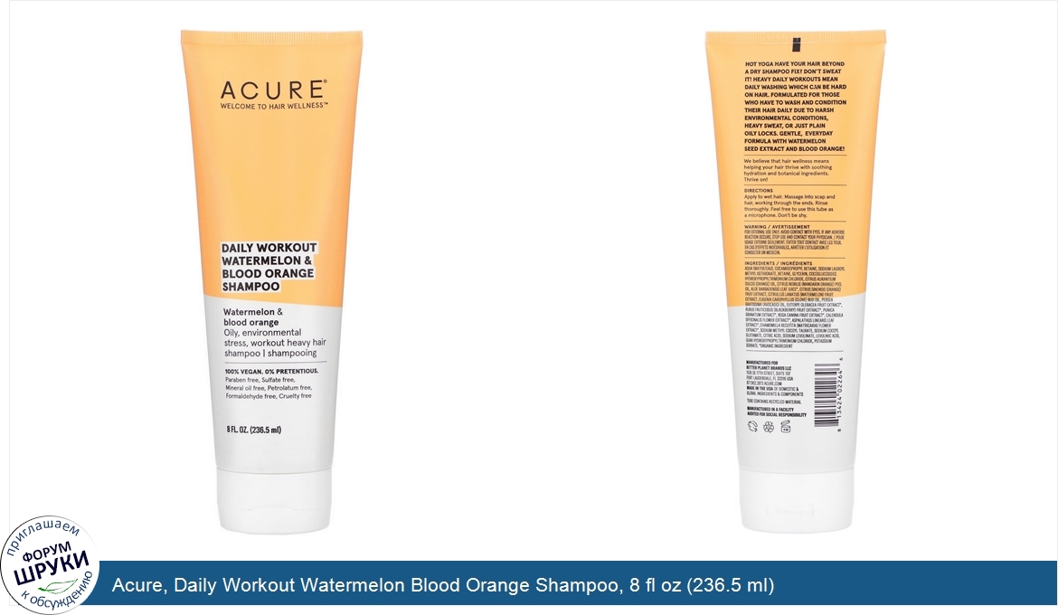 Друзья, если у вас есть отзыв/дополнение/комментарий/вопрос относительно Acure, Daily Workout Watermelon Blood Orange Shampoo, 8 fl oz (236.5 ml) - напишите его ответом в эту тему (это будет полезно всему сообществу в целом и вам в отдельности).