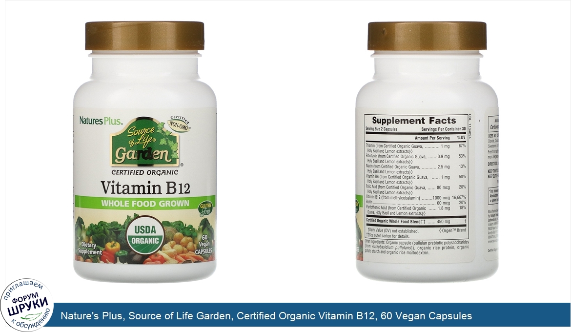 [DESCRIPT]Отсутствие ГМО сертифицировано. Органическое происхождение подтверждено Министерством сельского хозяйства США. Диетическая добавка. Не содержит глютена. Выращенные натуральные продукты. Пищевая добавка. Органический продукт, сертифицированный Ecocert ICO. Алиментарная поддержка, придающая энергию и жизненные силы, способствующая хорошей работе сердечно-сосудистой системы и улучшающая самочувствие. Витамин В12 от Nature's Plus Source of Life Garden. с набором нутриентов, соответствующим органическому золотому стандарту — это первая сертифицированная органическая пищевая добавка, содержащая придающий энергию и жизненные силы витамин В12 в удобных органических капсулах. Этот органический витамин B12 представляет собой метилкобаламин — высокоэффективную форму этого жизненно важного витамина с добавлением сертифицированных органических натуральных продуктов, богатых кофакторами, усиливающими его действие. Витамин В12 от Nature's Plus Source of Life Garden является сертифицированным органическим продуктом и содержит высококачественные питательные вещества, с которыми вы обязательно почувствуете разницу! Витамин В12 от Source of Life Garden. содержит:. Витамин В 12 в форме высококачественного метилкобаламина. Сертифицированная органическая смесь экстрактов гуавы, базилика священного и лимона, являющаяся источником натуральных кофакторов, усиливающих действие витамина. Сертифицированные органические натуральные продукты — более 20 разноцветных фруктов, овощей и трав для оптимальной поддержки. Продукт сертифицирован Министерством сельского хозяйства США как органический, не содержащий ГМО и глютена. Содержит более 20 натуральных органических продуктов. USDA Organic. — сертификат USDA NOP гарантирует чистоту и натуральность данной формулы,созданной из ингредиентов, выращенных без использования синтетических/химических пестицидов и искусственных удобрений. Сертифицирован на отсутствие ГМО - проверенный и сертифицированный независимыми структурами продукт на предмет отсутствия в нем генетически модифицированных материалов и материалов, связанных с организмами ГМ. Веганский продукт. — изготовлен без использования ингредиентов животного происхождения. Не содержит глютена - производится без пшеницы, ячменя или любых компонентов, содержащих глютен, а также проанализирован и проверяется на соответствие всем безглютеновым стандартам. Не содержит дрожжей - разработан и изготовлен без каких-либо дрожжей или побочных продуктов дрожжей и, следовательно, не производит потенциальных побочных эффектов дрожжей. Сертифицирован на GMP независимой структурой - Производственные мощности сертифицированы независимыми структурами на соответствие строгим правилам организации производства и контроля качества лекарственных средств (GMP), требуемых законодательством США. Отсутствие аллергенов FALCPA - гарантированное отсутствие всех основных аллергенов, идентифицированных в Законе о маркировке и защите потребителей США от пищевых аллергенов.[/DESCRIPT]... (описание дополняется)