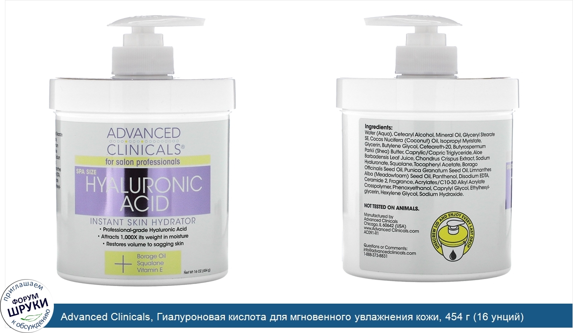 Друзья, если у вас есть отзыв/дополнение/комментарий/вопрос относительно Advanced Clinicals, Гиалуроновая кислота для мгновенного увлажнения кожи, 454 г (16 унций) - напишите его ответом в эту тему (это будет полезно всему сообществу в целом и вам в отдельности).