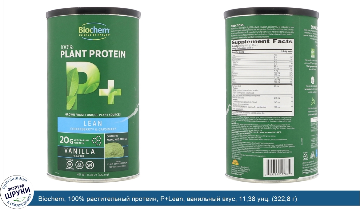 Друзья, если у вас есть отзыв/дополнение/комментарий/вопрос относительно Biochem, 100% растительный протеин, P+Lean, ванильный вкус, 11,38 унц. (322,8 г) - напишите его ответом в эту тему (это будет полезно всему сообществу в целом и вам в отдельности).