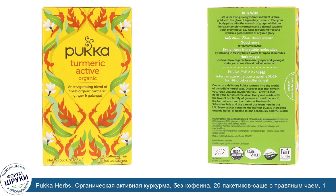 [DESCRIPT]Certified Organic by Soil Association Certification. USDA Organic. FairWild. Organic is Non GMO. Fair for Life - Fair Trade. Kosher. An invigorating blend of finest organic turmeric, ginger galangal. Run Wild. Life is for living. Every vibrant moment is pure gold with the glow of legendary turmeric. Feel your body pulse with the warmth of ginger whilst our herbal champions turmeric and galangal support your every move. Say hello to running free and wild in a golden blaze of organic glory. Good news for dynamic living. Puk-ka: Adjective: excellent, proper or genuine origin from Hindi pakka: authentic, real. Come on a delicious Pukka journey into the world of incredible herbal teas. Discover teas that refresh you, relax you and invigorate you - a world that helps your senses come alive. Every one made with the love of our family of growers around the world, the herbal wisdom of our Master Herbasmith Sebastian Pole and the care of our team here in the UK. Every sachet contains the highest quality incredible organic herbs. Welcome to our deliciously colorful world.[/DESCRIPT]... (описание дополняется)