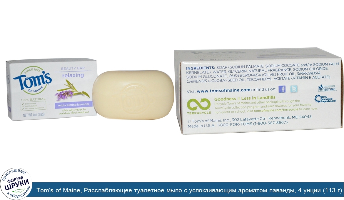 Tom's of Maine, Расслабляющее туалетное мыло с успокаивающим ароматом лаванды, 4 унции (113 г)