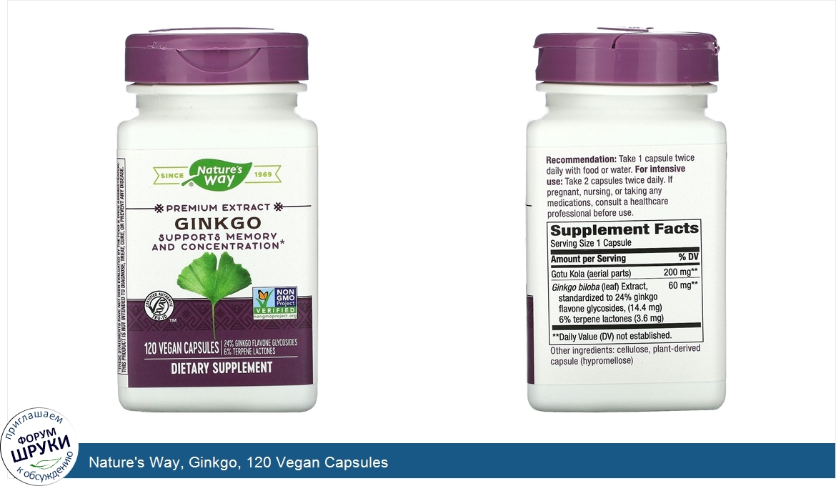 [DESCRIPT]Since 1969. Premium Extract. Supports Memory and Concentration. Certified Authentic TRU-ID™. Non GMO Project Verified. 24% Ginkgo Flavone Glycosides. 6% Terpene Lactones. Dietary Supplement. Vegan. Supports Memory and Concentration. Ginkgo tree date back to the prehistoric era, and have been known to live for up to 4,000 years. The trees grow in a multitude of environmental conditions, and are remarkably resilient to diseases and pests. The leaves have been used in wellness practices for thousands of years to support memory and concentration. At Nature's Way®, we believe nature knows best. That's why our mission is to seek out the best herbs the earth has to give. It's the way we deliver uncompromising quality and help you live healthier.[/DESCRIPT]... (описание дополняется)