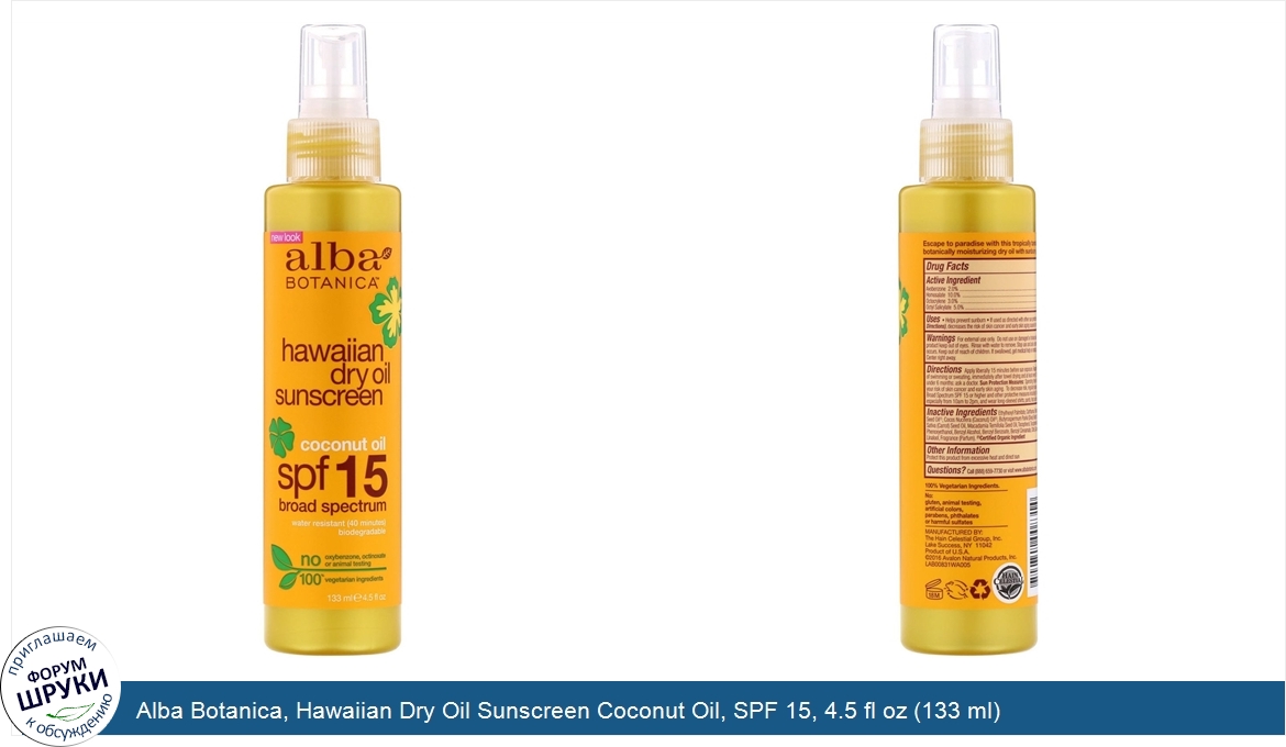 Друзья, если у вас есть отзыв/дополнение/комментарий/вопрос относительно Alba Botanica, Hawaiian Dry Oil Sunscreen Coconut Oil, SPF 15, 4.5 fl oz (133 ml) - напишите его ответом в эту тему (это будет полезно всему сообществу в целом и вам в отдельности).