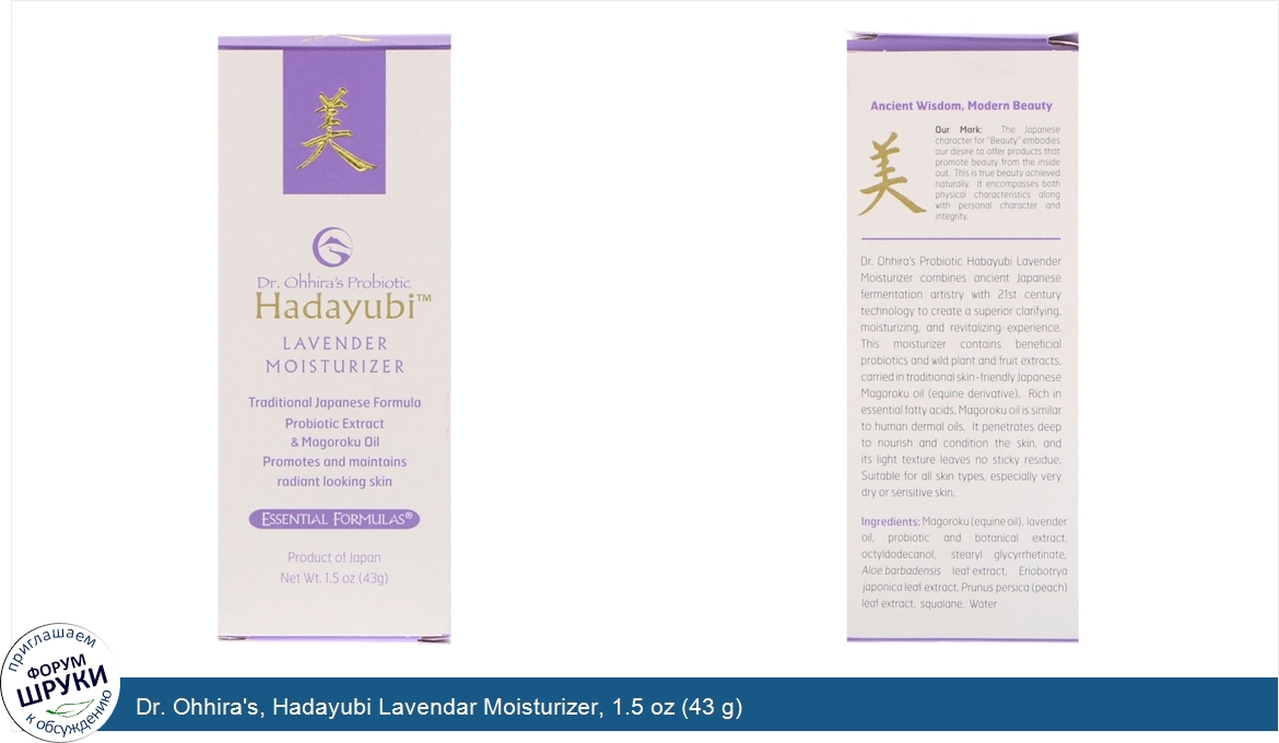 [DESCRIPT]Traditional Japanese Formula. Probiotic Extract Magoroku Oil. Promotes and Maintains Radiant Looking Skin. Not Tested On Animals. Ancient Wisdom, Modern Beauty. Our Mark: The Japanese character for "Beauty" embodies our desire to offer products that promote beauty from the inside out. This is true beauty achieved naturally. It encompasses both physical characteristics along with personal character and integrity. Dr. Ohhira's Probiotic Hadayubi Lavender Moisturizer combines ancient Japanese fermentation artistry with 21st century technology to create a superior clarifying, moisturizing, and revitalizing experience. This moisturizer contains beneficial probiotics and wild plant and fruit extracts, carried in traditional skin-friendly Japanese Magoroku oil (equine derivative). Rich in essential fatty acids. Magoroku oil is similar to human dermal oils. It penetrates deep to nourish and condition the skin, and its light texture leaves no sticky residue. Suitable for all skin types, especially very dry or sensitive skin. Suitable for daily use and appropriate for both body and face. Dr. Ohhira's Probiotic Hadayubi Lavender Moisturizer moisturizes and nourishes while soothing dry irritated skin. This all natural, botanical, probiotic moisturizer is ideal for sensitive skin, but is appropriate for all skin types. Gentle enough for a newborn's delicate skin.[/DESCRIPT]... (описание дополняется)