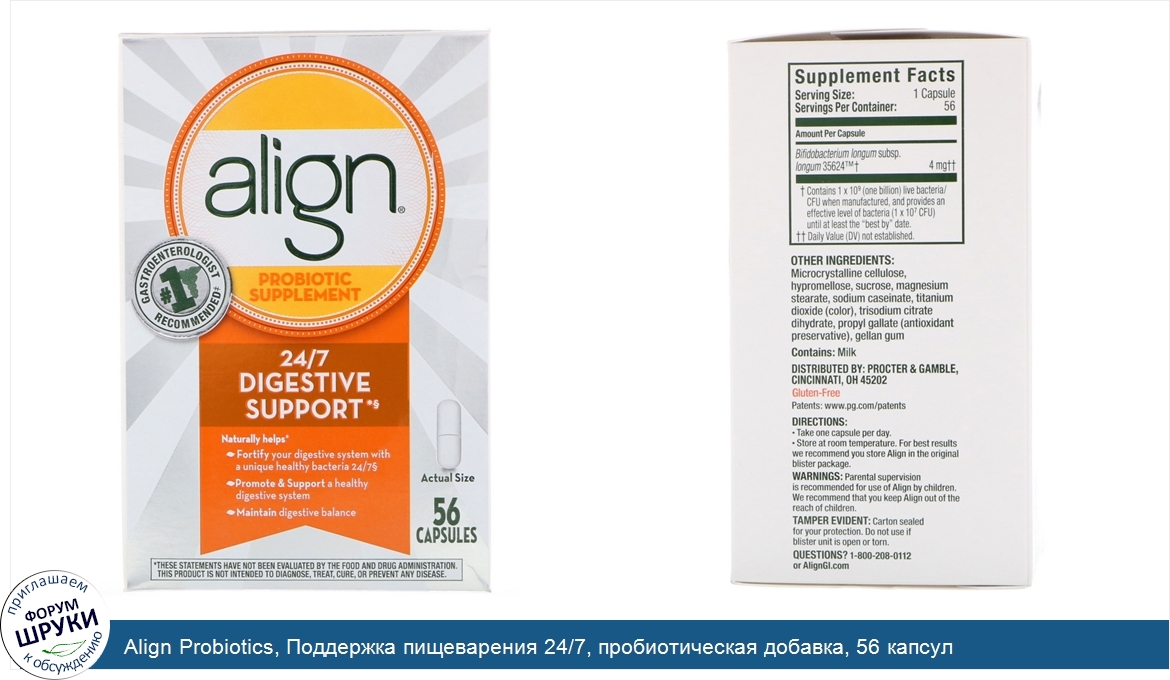 [DESCRIPT]#1 Gastroenterologist Recommended. ‡. Probiotic Supplement. Gluten-Free. Rooted in Nature. Backed by Science. Naturally Helps:. Fortify your digestive system with a unique healthy bacteria 24/7. §. Promote Support a healthy digestive system. Maintain digestive balance. Why Use Align? Developed by Gastroenterologists. Only Align fortifies the digestive system 24/7 with unique Bifidobacterium 35624. §. Common issues such as diet, changes in routine, travel, and stress may disrupt your natural balance of good bacteria. Diet. Changes in Routine. Travel. Stress. Compare Align Digestive Support to Other Probiotic Supplements. Align. Others. Contains the unique, patented, pure-strain Bifidobacterium 35624. Yes. No. #1 Gastroenterologist recommended probiotic brand. ‡. Yes. No. Align Probiotic is the product of over 10 years of scientific research and contains the unique, pure-strain probiotic Bifidobacterium 35624. Align is a great way to help support your digestive balance. Align has been the #1 recommended probiotic brand by Gastroenterologists (Doctors who are experts in digestive health) for over 10 years in a row. §With continued use. ‡Among gastroenterologists who recommend a brand of probiotic in AlphalmpactRx 2008-2017 surveys.[/DESCRIPT]... (описание дополняется)