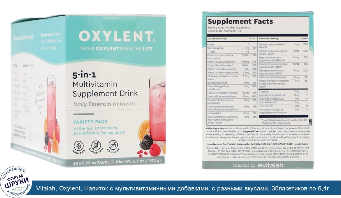 Друзья, если у вас есть отзыв/дополнение/комментарий/вопрос относительно Vitalah, Oxylent, Напиток с мультивитаминными добавками, с разными вкусами, 30пакетиков по 6,4г (0,23унции) каждый - напишите его ответом в эту тему (это будет полезно всему сообществу в целом и вам в отдельности).