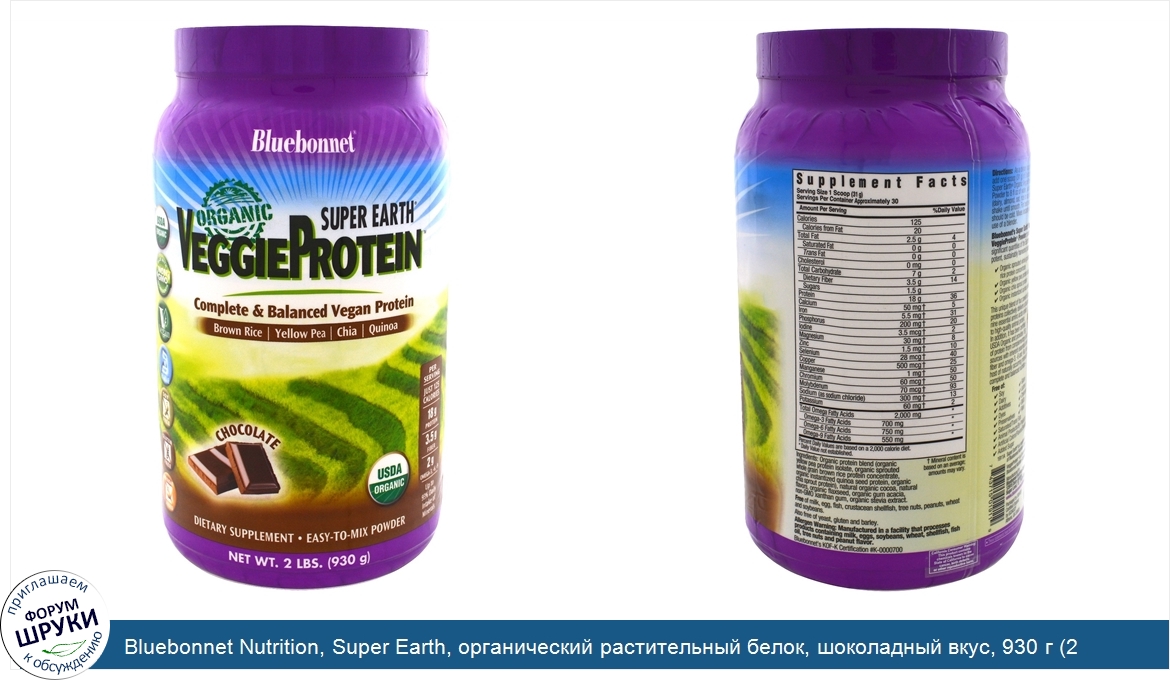 [DESCRIPT]Complete Balanced Vegan Protein. Brown Rice - Yellow Pea - Chia - Quinoa. USDA Organic. Made with Non GMO Ingredients. Vegan. K-Parve. Soy Free. Gluten Free. No Sugar Added. Dietary Supplement. Easy-to-Mix-Powder. Sustainably Harvested. Certified Organic by GCIAOCP. Per Serving. Just 125 Calories. 18 g Protein. 3.5 g Fiber. 2 g Omega-3, 6,-9. Up to 93% Daily Intake of Minerals. Bluebonnet's Super Earth Organic VeggieProtein Powder provides significant quantities of the Earth's most potent, sustainably harvested plant proteins:. Organic sprouted whole grain brown rice protein concentrate. Organic yellow pea protein isolate. Organic chia sprout protein. Organic instantized quinoa seed protein. This unique blend of four powerful plant proteins collectively delivers a balance of all nine essential amino acids similar to high-quality animal protein. In addition, it has been certified USDA Organic and provides 18 g of protein from complementary plant source with inherent essential amino acids, fiber and omega-3, 6 and -9s, plus a whole host of naturally occurring minerals for complete and balanced nutrition. Free of:. Soy. Dairy. Additives. Dyes. Preservatives. Saturated/Trans Fats. Animal Products/By-Products. Artificial Colors/Flavors/Sweeteners. Added Sugar. Gluten. Lactose. Cholesterol. Fillers. This distinctive blend of four powerful plant protein delivers the foundational protein and nutrition your body craves to:. Support Muscle Tissue Development. Promote Heart Glucose Health. Maintain Lean Body Mass. Satisfy Cravings.[/DESCRIPT]... (описание дополняется)