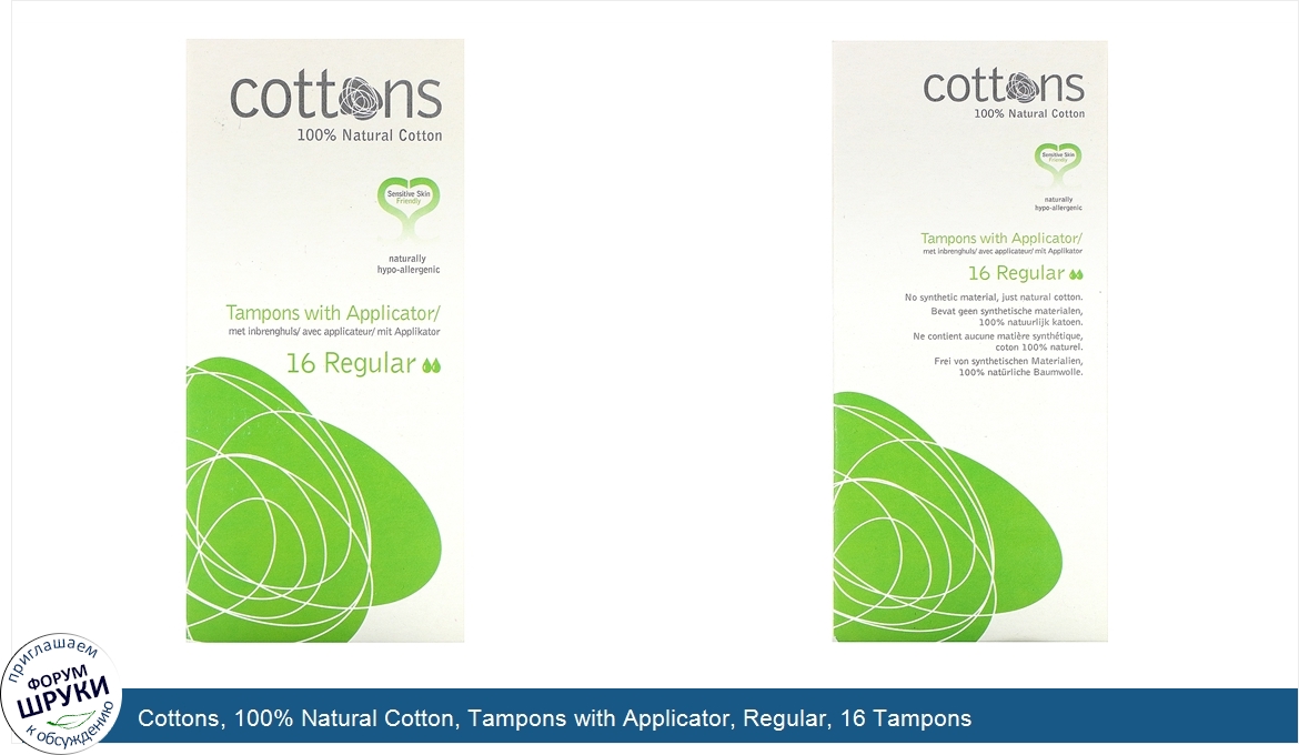Друзья, если у вас есть отзыв/дополнение/комментарий/вопрос относительно Cottons, 100% Natural Cotton, Tampons with Applicator, Regular, 16 Tampons - напишите его ответом в эту тему (это будет полезно всему сообществу в целом и вам в отдельности).
