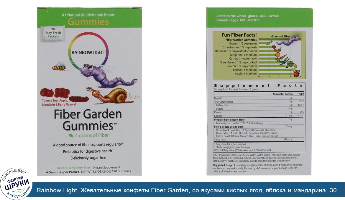 [DESCRIPT]#1 Natural Multivitamin Brands . 30 Stay - Fresh Packets. Yummy Sour Apple, Mandarin Berry Flavors! . 4 Grams of Fiber. Gluten Free. Dairy Free. A Good Source of Fiber Supports Regularity. Prebiotics for Digestive Health. Deliciously Sugar Free. Dietary Supplement. Getting kids to eat their fiber was never easier - or more delicious! The best sources of fiber are fruits, vegetables and whole grains, yet since many kids are picky eaters, they may not get enough from their daily diets. These naturally fruit-flavored gummies are a fun and delicious way to add more fiber to your child's day. Convenient single-serve packets are perfect for today's on-the-go lifestyles! . 4 grams of fiber prebiotics for regularity immune health. Prebiotic fiber support blend. Nutritious fruit vegetables. Fruit veggie vitality blend. May reduce the risk of dental caries. Xylitol - Sugar free. Made with natural fruit flavors colors. Natural flavors: sour apple, mandarin berry, natural colors: tomato lycopene, black carrot paprika, No preservatives or artificial sweeteners. Fun Fiber Facts! Fiber Garden Gummies . Grams of Fiber. Grapes, 1/2 cup green. Strawberries, 1/2 cup fresh. Oatmeal, 1/2 cup instant, cooked. Tangerine, 1 medium. Carrot, 1 medium raw. Green beans, 1/2 cup cooked. Broccoli, 1/2 cup cooked. Banana, 1 medium. Apple, 1 medium. 0. 1. 2. 3. 4.[/DESCRIPT]... (описание дополняется)