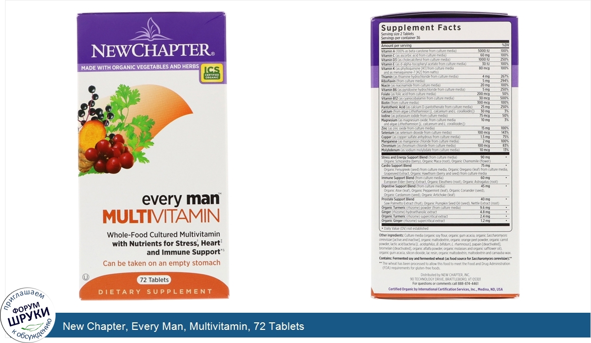 [DESCRIPT]Made with Organic Vegetables and Herbs. ICS Certified Organic. Whole-Food Cultured Multivitamin. With Nutrient for Stress, Heart and Immune Support. Can be Taken on an Empty Stomach. Kosher. Dietary Supplement. Certified Organic by International Certification Services. Non GMO Project Verified. Gluten Free. New Chapter's Guiding Principles. To deliver the wisdom of nature thus relieving suffering and promoting optimal health. To advance the organic mission, nourishing body and soul with the healing intelligence or pure whole foods and herbal supplements. To nurture and sustain mother earth, the source of natural healing. To honor and reward personal growth, for enlightened teamwork depends on the vitality of every member of the New Chapter family. Holistic. New Chapter Whole-Food Probiotic-Cultured Multis: More Than Food Supplements, They're Supplemental Food. Probiotic-Cultured. Fermented with beneficial probiotics. Non-GMO Project Verified. Made with organic vegetables and herbs. Whole-Food Complexed. Can be taken on an empty stomach. Health. Whole-Food Cultured -. Organic whole food cultured vitamins and minerals go beyond just addressing nutrient deficiencies to promote overall health and system-specific benefits with complementary herbs. Gentle. - Every Man is a probiotic -cultured multivitamin that can be taken anytime -even on an empty stomach! Stress Support. - Emerging studies suggest that taking a daily multivitamin provides support for occasional stress- Every Man also delivers complementary organic chamomile. Heart Immune Support. - Emerging studies suggested cultured vitamin D3 support cardiovascular health, while zinc and vitamins C A support immune system function with complementary elderberry and organic astragalus. Convenient -. Two-a-day multivitamin is formulated specifically for the needs of active men.[/DESCRIPT]... (описание дополняется)