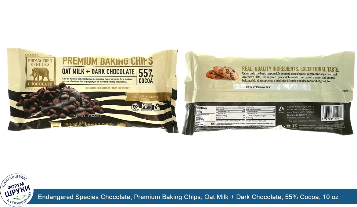 [DESCRIPT]Smooth Sweet. Certified Vegan. Non GMO Project Verified. Fairtrade®. Kosher Dairy. Certified Gluten Free. Our all-natural oat milk tames the complex flavor of cocoa for a modern take on chocolate that is perfect for an elevated baking experience. Real, Quality Ingredients. Exceptional Taste. Using only the best, responsibly sourced cocoa beans, vegan cane sugar, and real American Oats, Endangered Species Chocolate has created a sweet and creamy baking chip that supports a healthier lifestyle and does a world of good, too.[/DESCRIPT]... (описание дополняется)