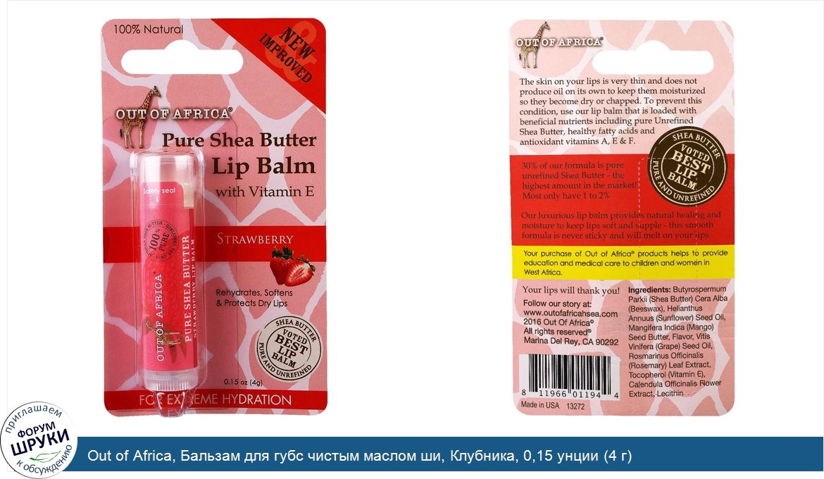 Друзья, если у вас есть отзыв/дополнение/комментарий/вопрос относительно Out of Africa, Бальзам для губс чистым маслом ши, Клубника, 0,15 унции (4 г) - напишите его ответом в эту тему (это будет полезно всему сообществу в целом и вам в отдельности).