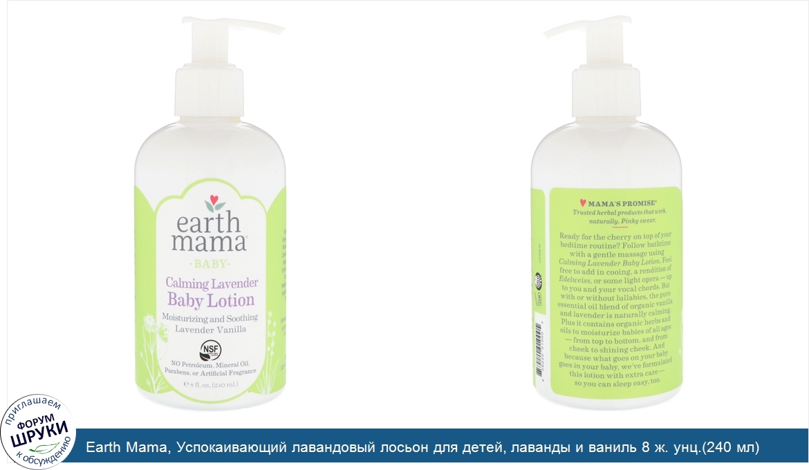 Друзья, если у вас есть отзыв/дополнение/комментарий/вопрос относительно Earth Mama, Успокаивающий лавандовый лосьон для детей, лаванды и ваниль 8 ж. унц.(240 мл) - напишите его ответом в эту тему (это будет полезно всему сообществу в целом и вам в отдельности).