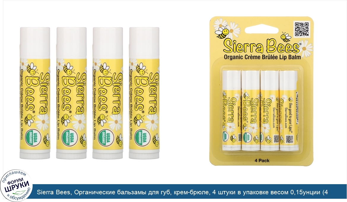 Sierra Bees, Органические бальзамы для губ, крем-брюле, 4 штуки в упаковке весом 0,15унции (4,25г) каждая