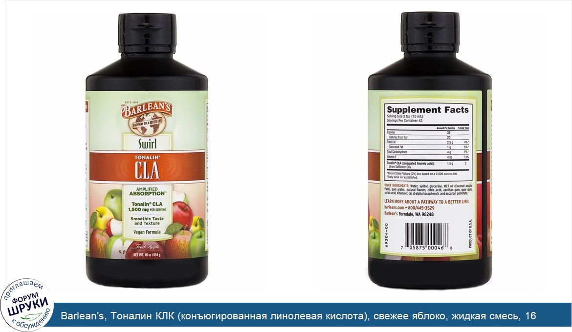 Друзья, если у вас есть отзыв/дополнение/комментарий/вопрос относительно Barlean's, Тоналин КЛК (конъюгированная линолевая кислота), свежее яблоко, жидкая смесь, 16 унций (454 г) - напишите его ответом в эту тему (это будет полезно всему сообществу в целом и вам в отдельности).