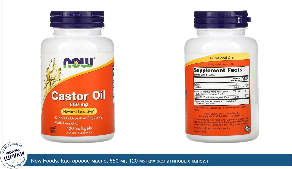 Now Foods, Касторовое масло, 650 мг, 120 мягких желатиновых капсул
