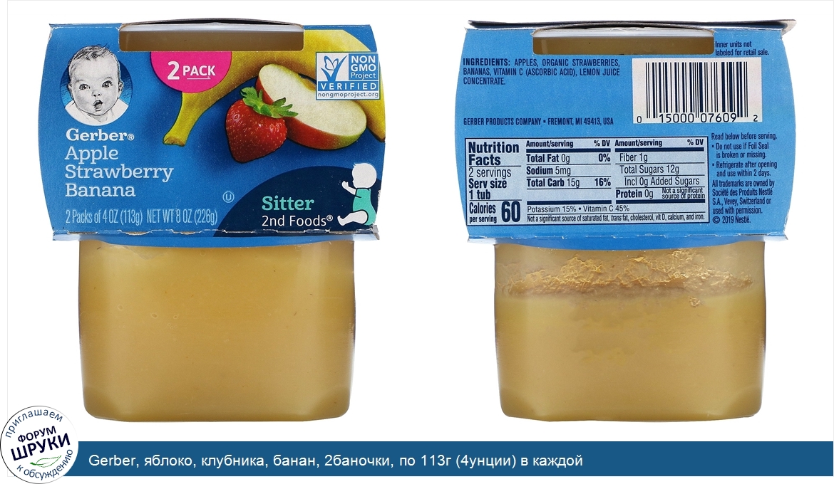 Gerber, яблоко, клубника, банан, 2баночки, по 113г (4унции) в каждой