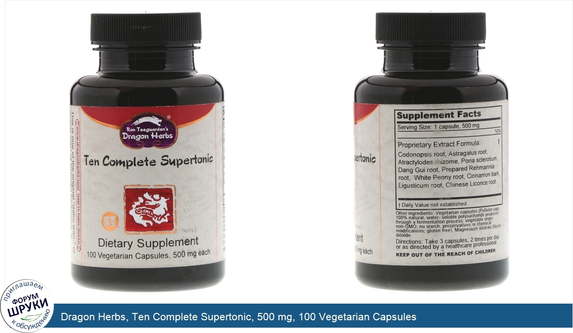 Друзья, если у вас есть отзыв/дополнение/комментарий/вопрос относительно Dragon Herbs, Ten Complete Supertonic, 500 mg, 100 Vegetarian Capsules - напишите его ответом в эту тему (это будет полезно всему сообществу в целом и вам в отдельности).