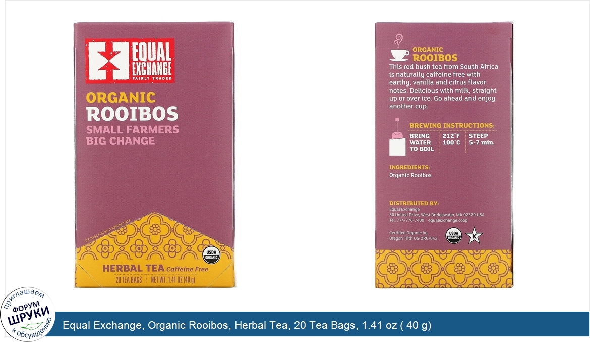 [DESCRIPT]Small Farmers. Big Change. Caffeine Free. USDA Organic. Equal Exchange Fairly Traded. Certified Organic by Oregon Tilth. Kosher. Most teas—even Fair Trade—come from plantations where workers have little say, and are often trapped in a system of dependency. Together, we are building a different tea model, one that gives small farmers greater access to the market, affording them more economic power, better lives and healthier communities. This herbal tea comes from the Wupperthal Original Rooibos Co-operative, a democratically organized group of small-scale farmers who have grown Rooibos in South Africa for generations. These farmers were pushed off the most fertile land in the 1800's and later endured segregation imposed by apartheid. Their dry land is a challenge for most crops. But with Rooibos, the slower growth results in quality that can't be found anywhere else. This red bush tea from South Africa is naturally caffeine free with earthly, vanilla and citrus flavor notes. Delicious with milk, straight up or over ice. Go ahead and enjoy another cup.[/DESCRIPT]... (описание дополняется)